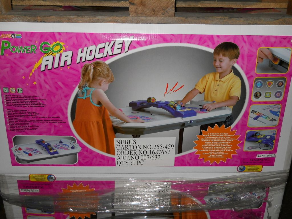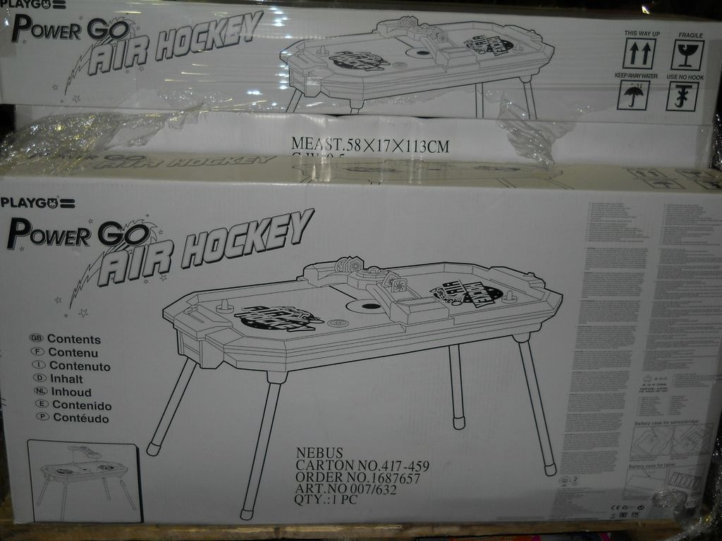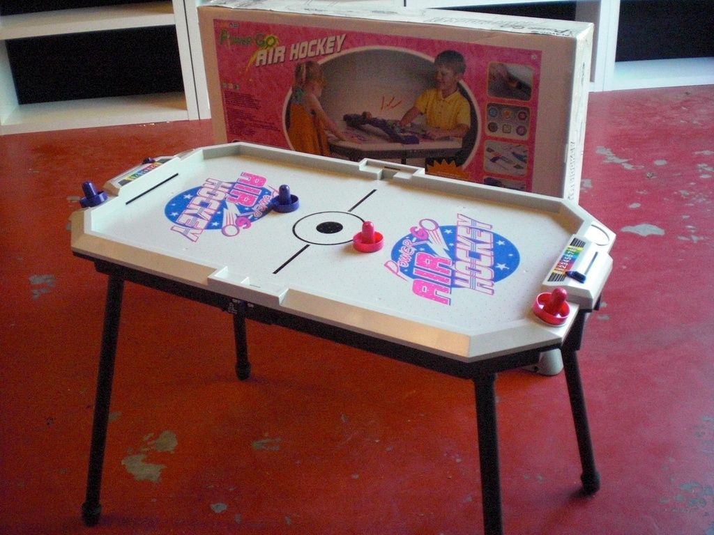 AC Power air hockey table with electronic sensor and electronic sound. High fan speed. Excluding batteries (6 x 1.5 V AA), including adapter.