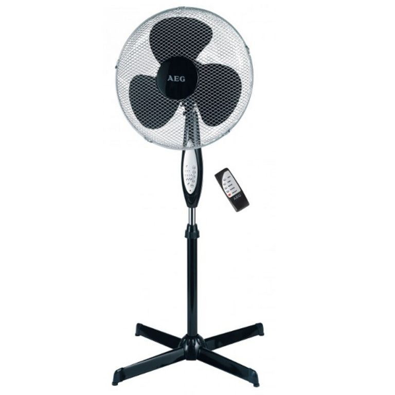 Oscillating Stand Fan with adjustable height and angle. Equipped with timer and remote control.