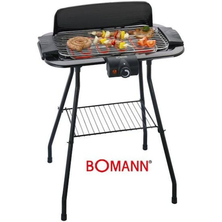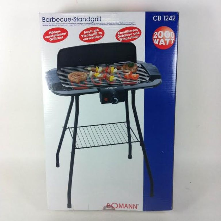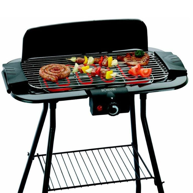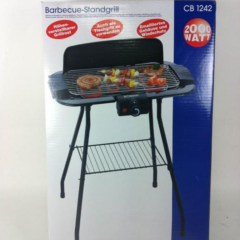 Barbecue in stylish design for grilling without fire and smoke. Infinitely adjustable thermostat controll light. Height adjustable, chromed grill. Enamelled body and windshield.