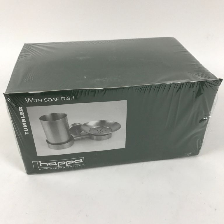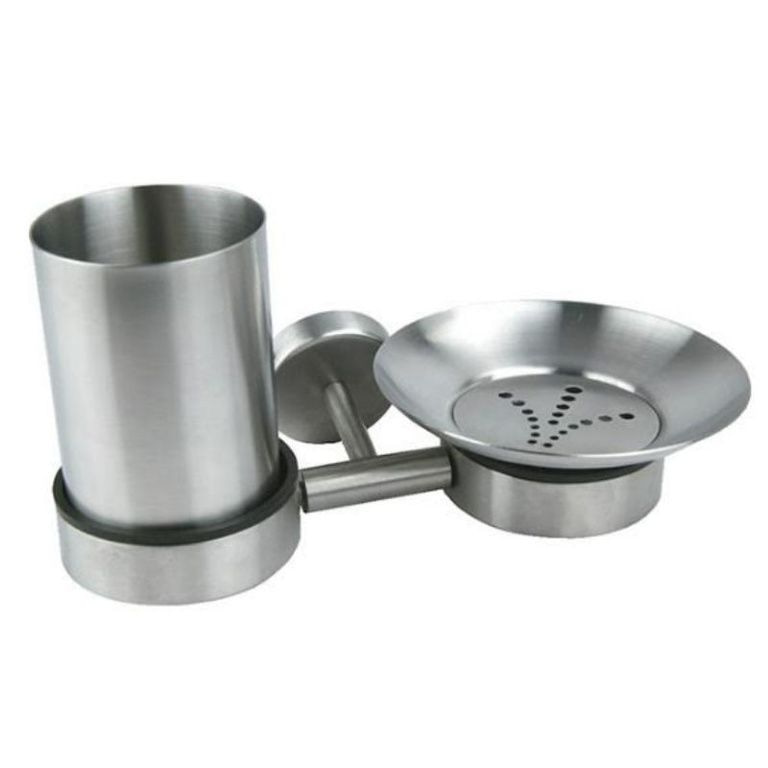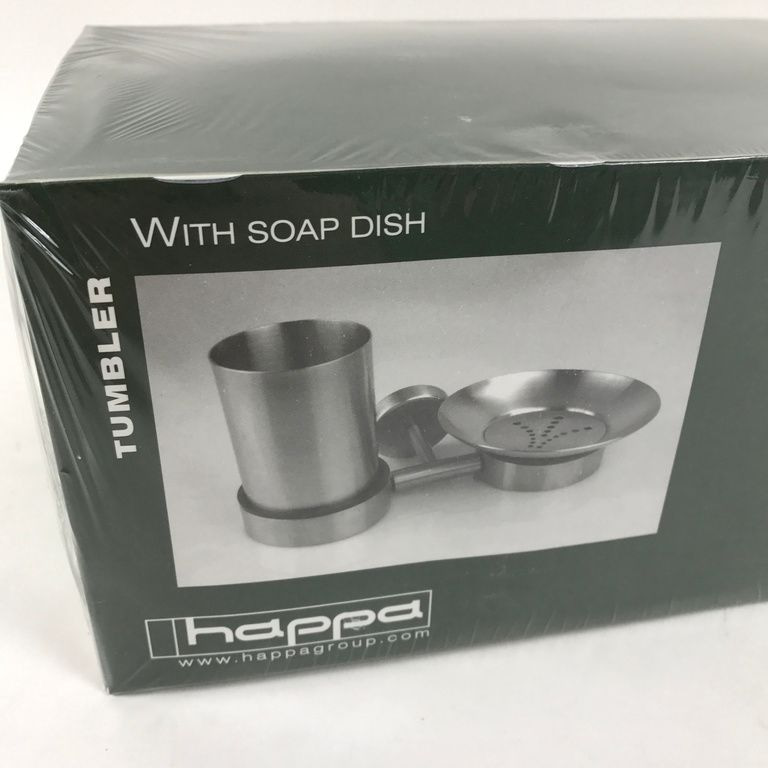 Bathroom Cup & Soap holder. This Happa Bathroom set includes a stainless steel plate with wall mounting. This wall mount is placed a cup for toothbrushes, toothpaste and other attributes. Also, there is attached a plate for holding loose soap on the place. The whole is made of high quality stainless steel.