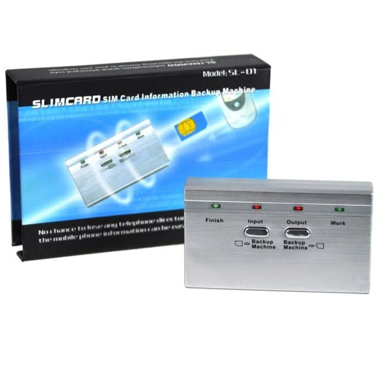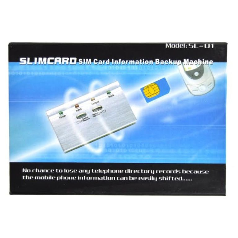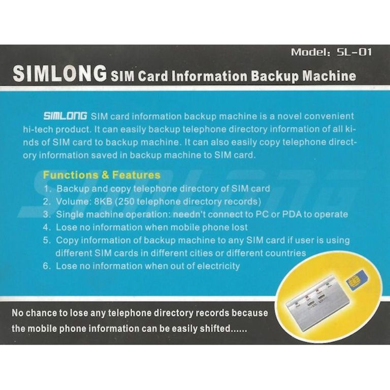 The Smart Card Sim card information backup machine is a handy hi-tech product. It simply makes a backup of your Telephone Directory (names and phone numbers) on your mobile phone. This directory information from your mobile phone is then stored on the Smart Card.