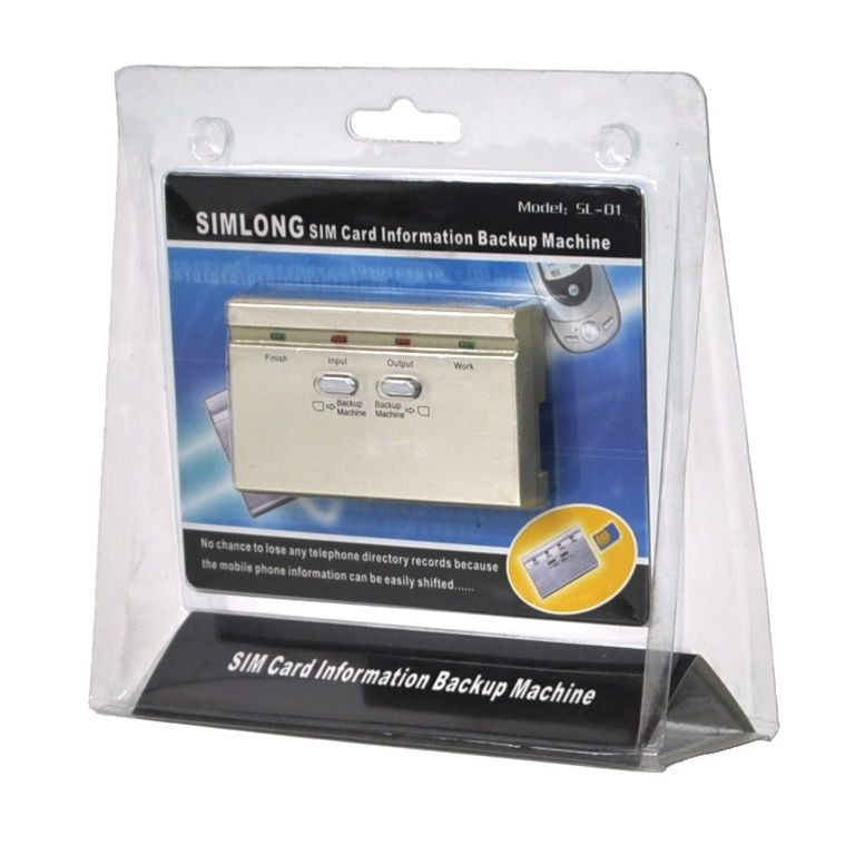 The Smart Card Sim card information backup machine is a handy hi-tech product. It simply makes a backup of your Telephone Directory (names and phone numbers) on your mobile phone. This directory information from your mobile phone is then stored on the Smart Card.