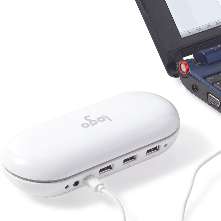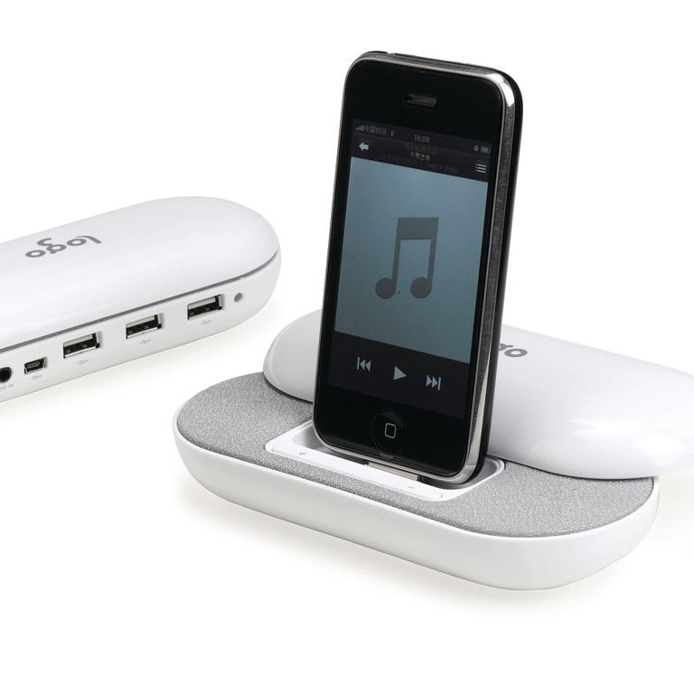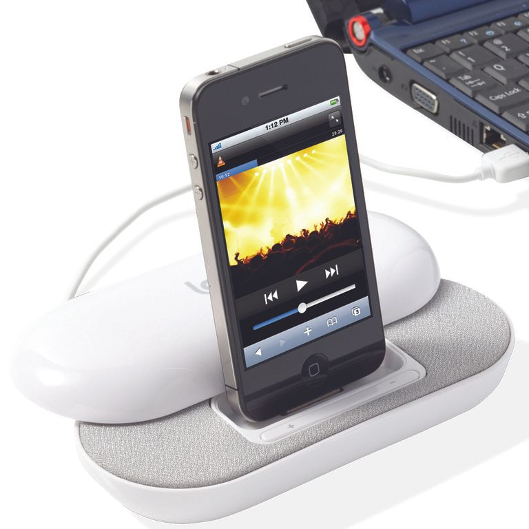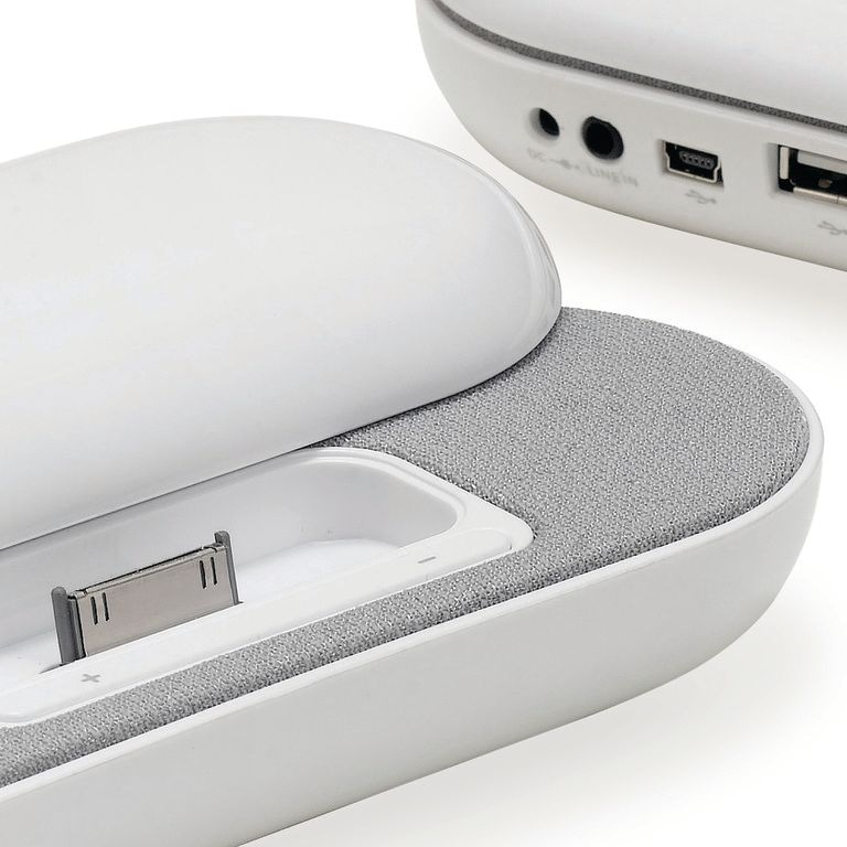 iPhone / iPod (TM) stereo docking speaker. USB 2.0 offers three USB ports. Suitable for Smart phones, MP3 / MP4, laptops and PCs via the 3.5mm line in cable provided. Output 2 x 1.5W iPhone / iPod. Material: ABS.