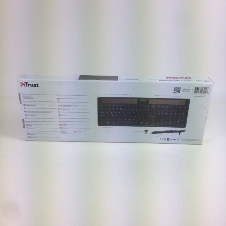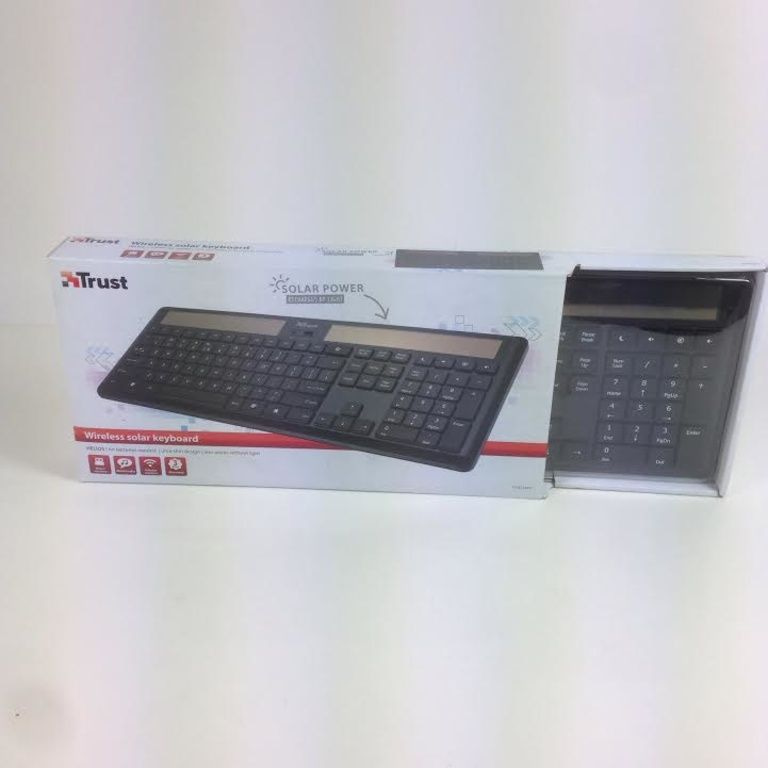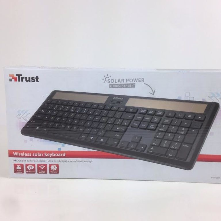 Wireless keyboard with solar cells; Charging is done by sunlight or daylight, so no batteries required.