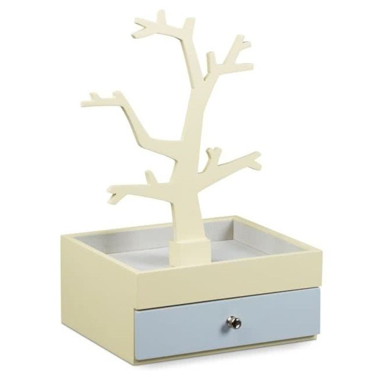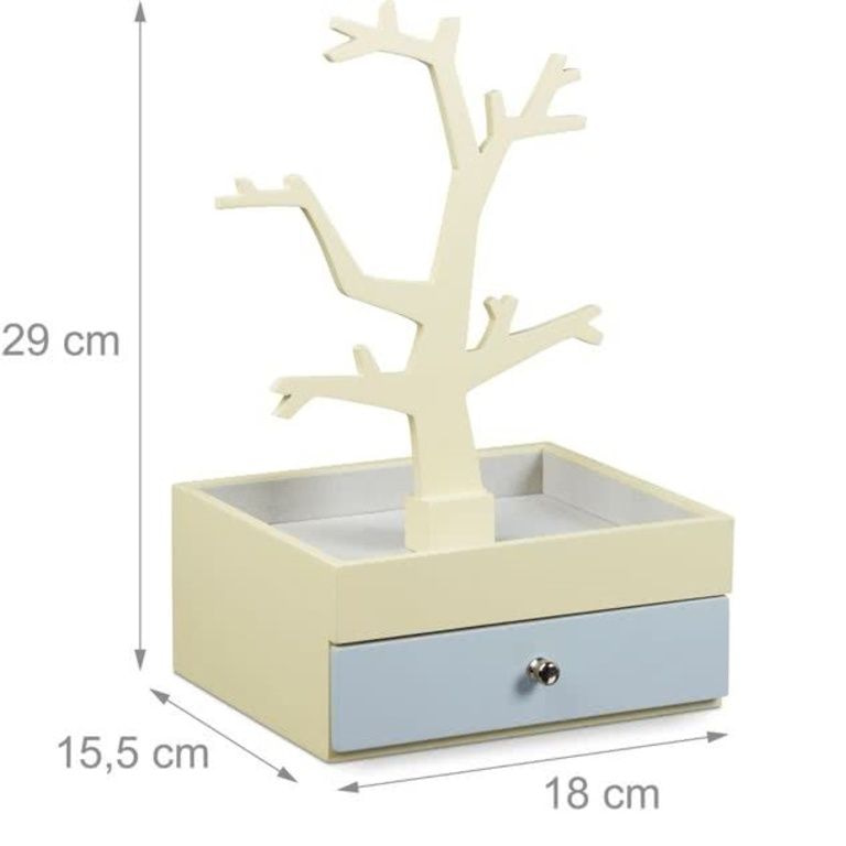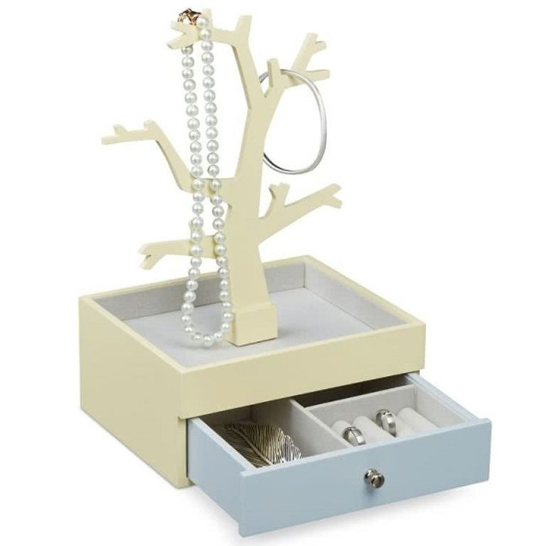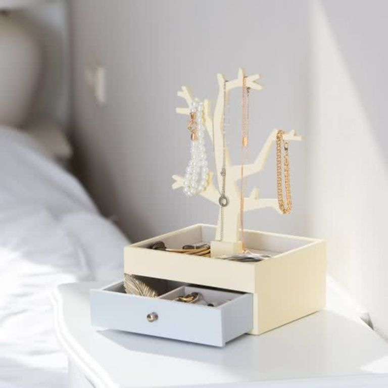 - In beige-yellow and light gray Jewelry box with la and jewelery tree