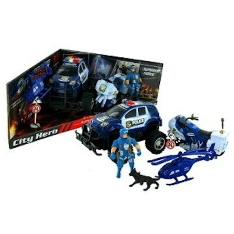 Tough police play set consisting of: Car, motorcycle, helicopter, police officer and many accessories.