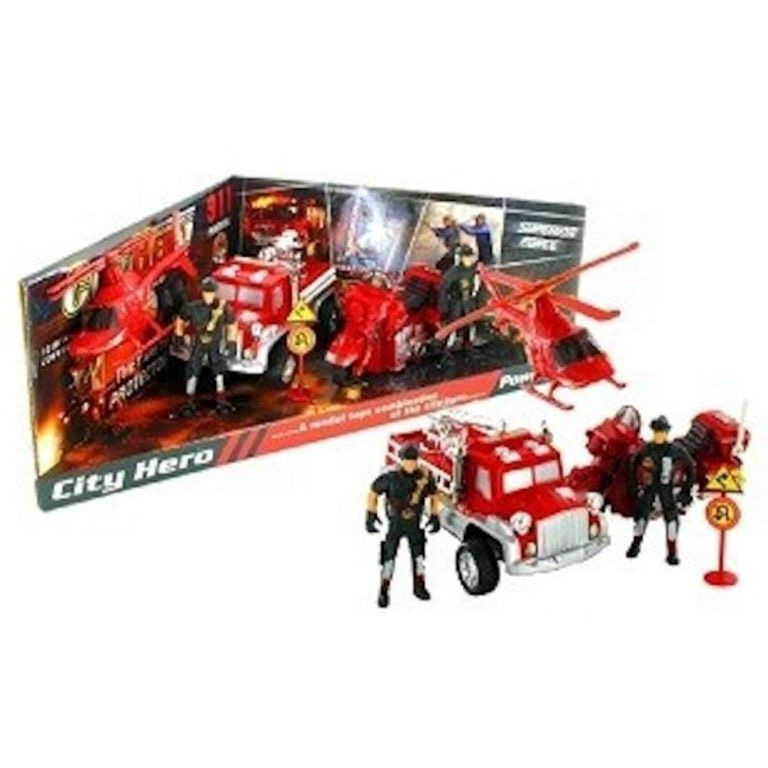 Tough fire play set consisting of: fire engine, engine, helicopter, fireman and many accessories.