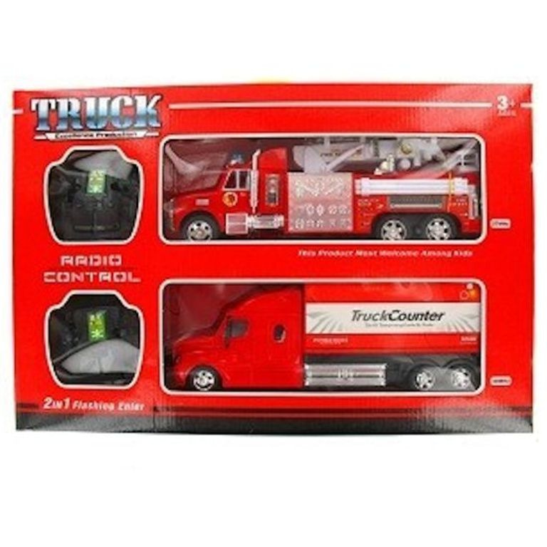 Two radio controlled trucks, 1x and 1x Fire Truck. Set them on two different channels and race against each other.