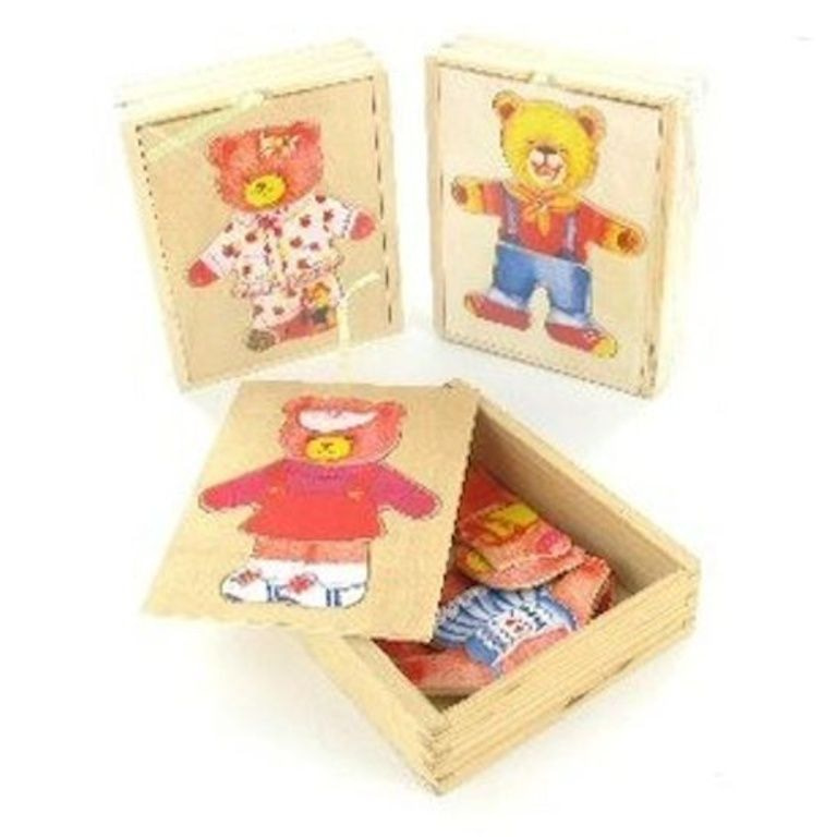 Wooden box (12 x 14 cm.) With 6 pieces of wood so that it can be.'s Face and clothes of the bear changed
