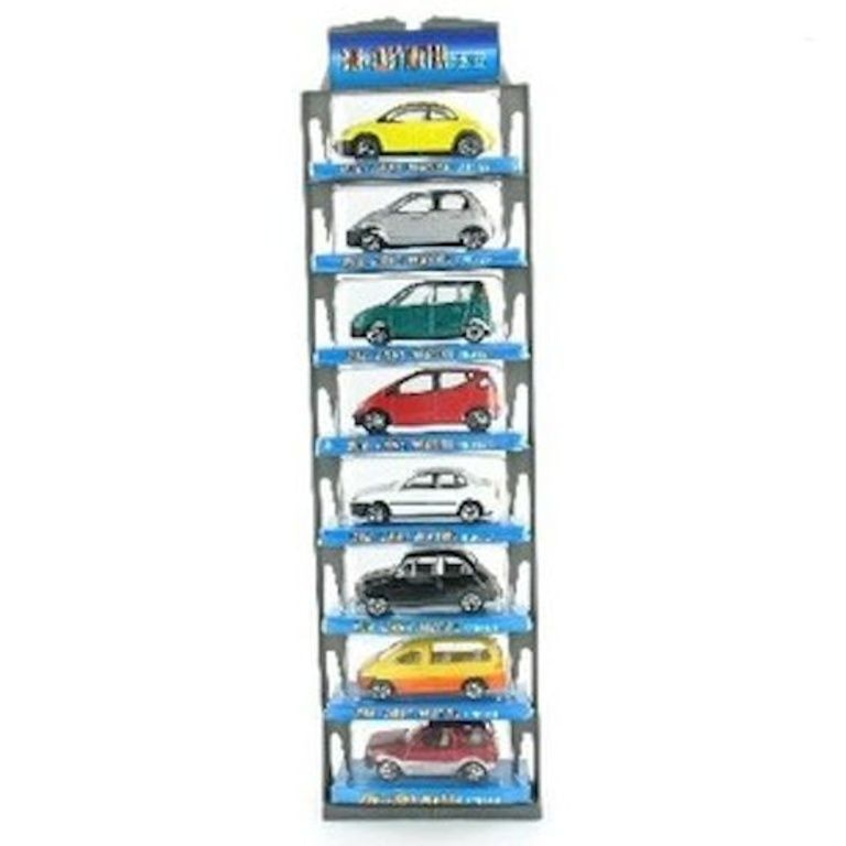 Beautiful metal cars packed per 8 pieces on a hanging card.