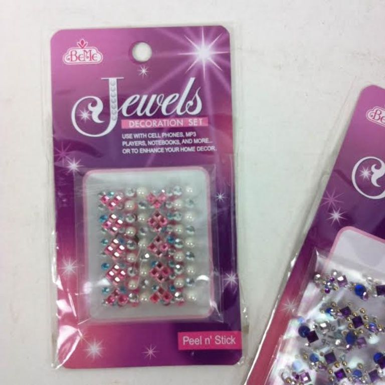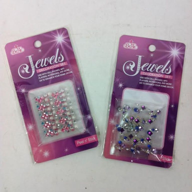 Pimp everything nailed down with these adhesive bling diamonds. The package consists of twelve sheets in different colors and different shapes like stars and hearts, diamonds. On each sheet you will find a great pair of adhesive diamonds.